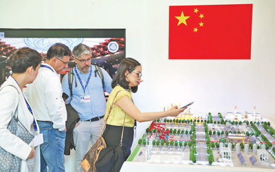 COP28举办期间,中国碳捕集利用与封存技术受到各方关注。图为人们在中国角参观中国首套百万吨级二氧化碳捕集利用封存项目模型。