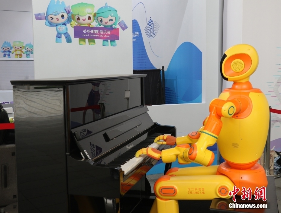 钢琴机器人在杭州亚运村内弹奏乐曲。