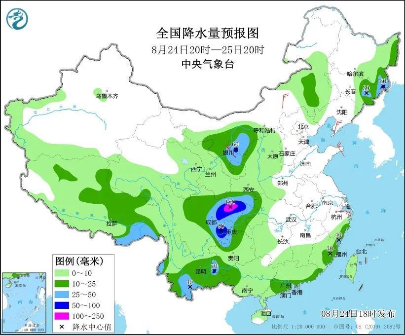 内蒙古东南部和西部、吉林东部、西藏东部、甘肃东部、宁夏、四川、贵州西北部、陕西北部、广西西北部、广东南部等地部分地区有中到大雨,其中,四川东北部、重庆西部等地部分地区有暴雨或大暴雨。
