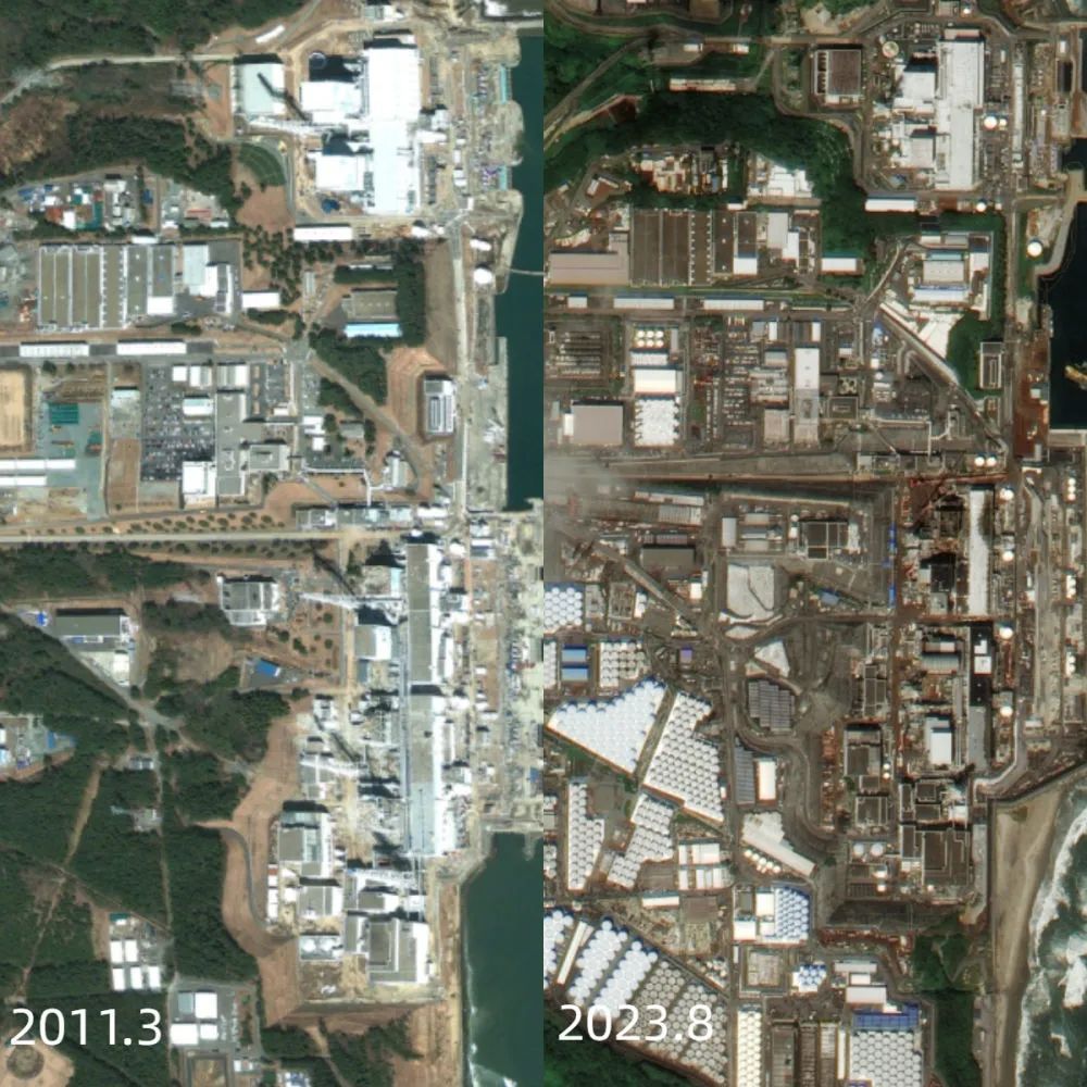 下图为福岛第一核电站卫星影像对比图,从对比中可以明显看到,2011年3月11日的地震后,日方在厂区内修建了密密麻麻的圆形核污染水储水罐。