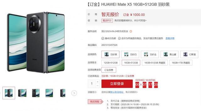 与华为Mate 60 Pro +开启预订的同时,华为还宣布Mate X5加入先锋计划,正式开启预订。华为商城销售页面显示,该机型预计9月24日前发货。不过,截至10点10分,该机型已被抢购一空,处于缺货状态。