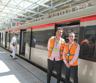 8月6日,在埃及斋月十日城轻轨铁路阿德利·曼苏尔车站,两名铁路工作人员合影留念。
