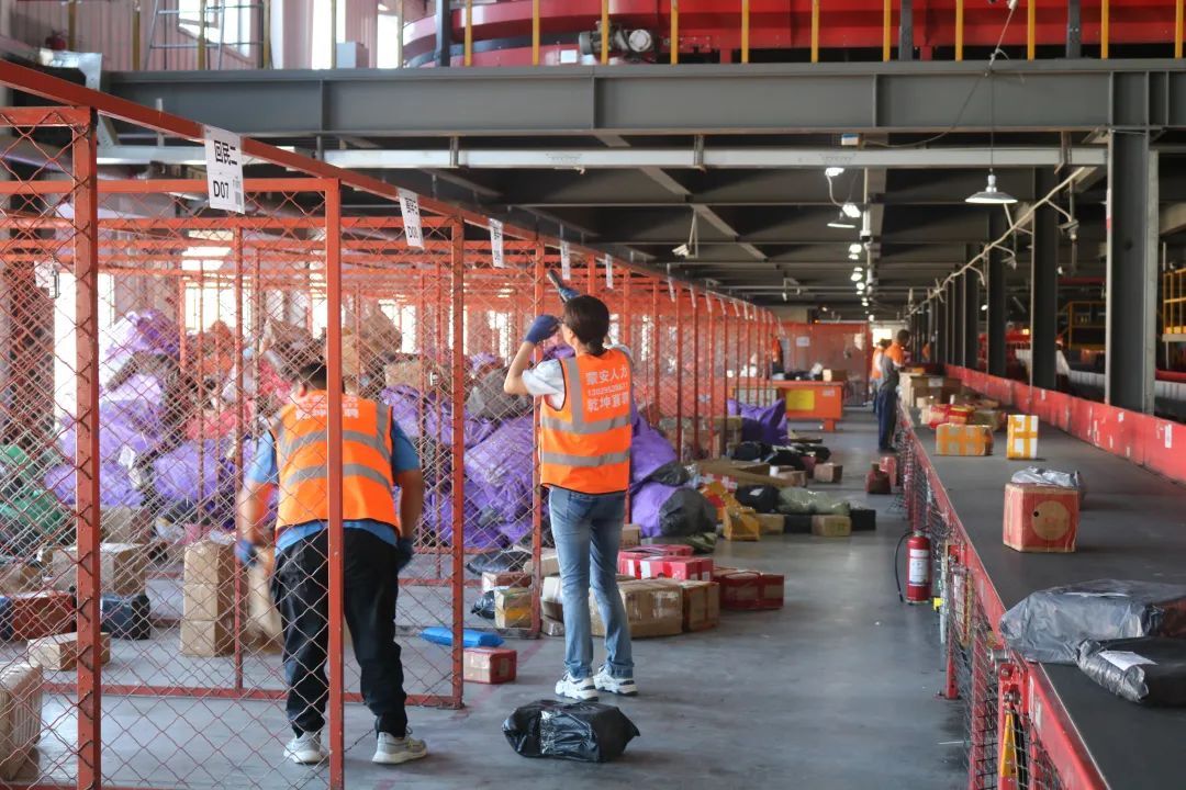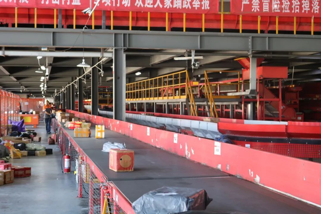 身处园区,车流如织。一辆辆标有快递公司名称的货车有序地排列在各自的分拣中心门前,源源不断地快递通过传输带有序进入分拣中心。