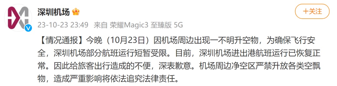 10月23日,据@深圳机场:因机场周边出现一不明升空物,为确保飞行安全,深圳机场部分航班运行短暂受限。目前,深圳机场进出港航班运行已恢复正常。因此给旅客出行造成的不便,深表歉意。机场周边净空区严禁升放各类空飘物,造成严重影响将依法追究法律责任。