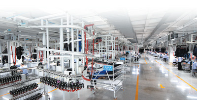 天花板上的吊挂线蜿蜒分布,一件件西服、西裤正在轨道上被匀速传送着。生产工位按照工序环节被安排在吊挂线下方,智能系统自动分配订单到工位,工人在完成对应工序后,再将服装挂回吊挂线,传送带便会自动走向下一道工序。
