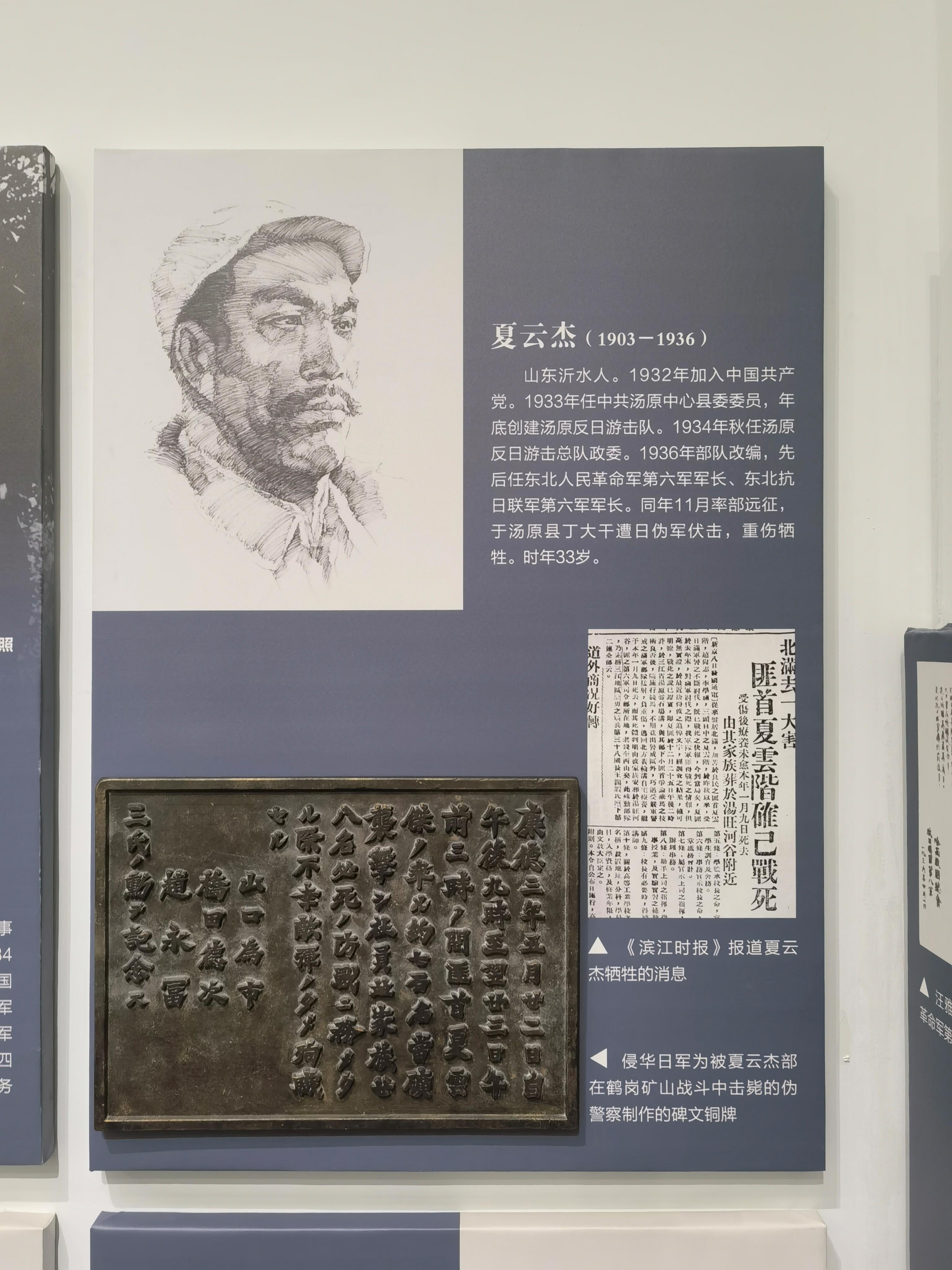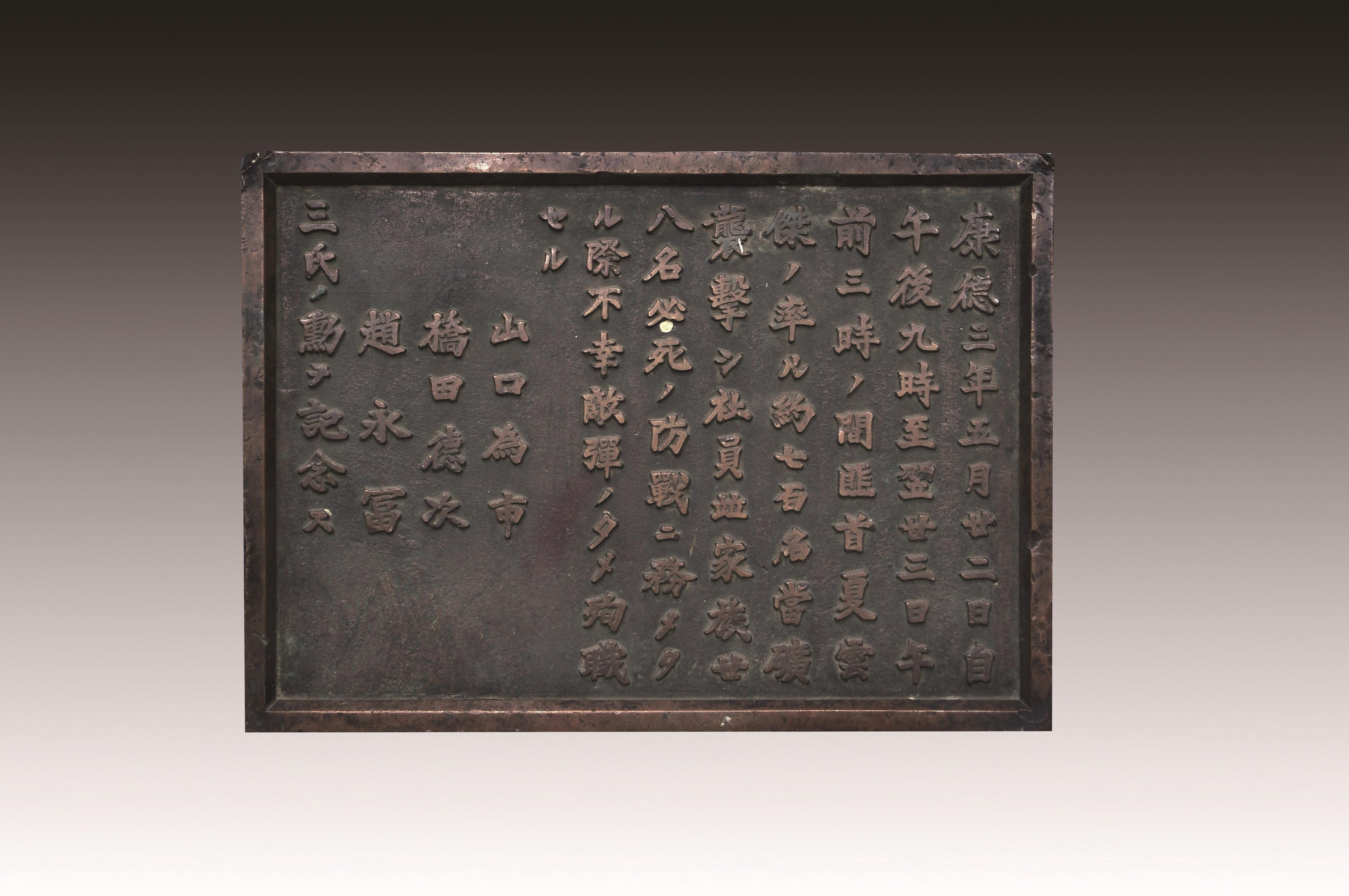 这块碑文铜牌来自黑龙江鹤岗矿区的一座“忠灵塔”上,是日本侵略者为侵华战争中战死的日伪军而建。碑文铜牌,长51厘米、高36.5厘米、宽2厘米、重12千克。上面的文字记载了日伪军和抗联战士战斗过程。从表述内容来看,这块碑文具有极大欺骗性。它制造了普通百姓遭土匪袭击的“无辜”假象,妄图以此加深东北民众与革命队伍之间的对立情绪。而事实真相是,1936年5月22日夜,东北人民革命军第六军军长夏云杰指挥六军第一、二、三团,分兵两路袭击了鹤岗矿山。在我党地下工作人员的密切配合下,顺利解除了矿山警察二队的全部武装,并击毙日军指导官山口为市、桥田德次和伪矿山警察大队队长赵永富。这次战斗缴获敌人大批枪支弹药,我军无一人伤亡。23日凌晨,夏云杰率领部队携带战利品凯旋。