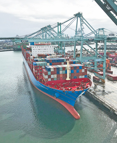 中远海运集团的远洋运输船舶停靠在美国洛杉矶港西港池集装箱码头。中远海运集团北美公司供图