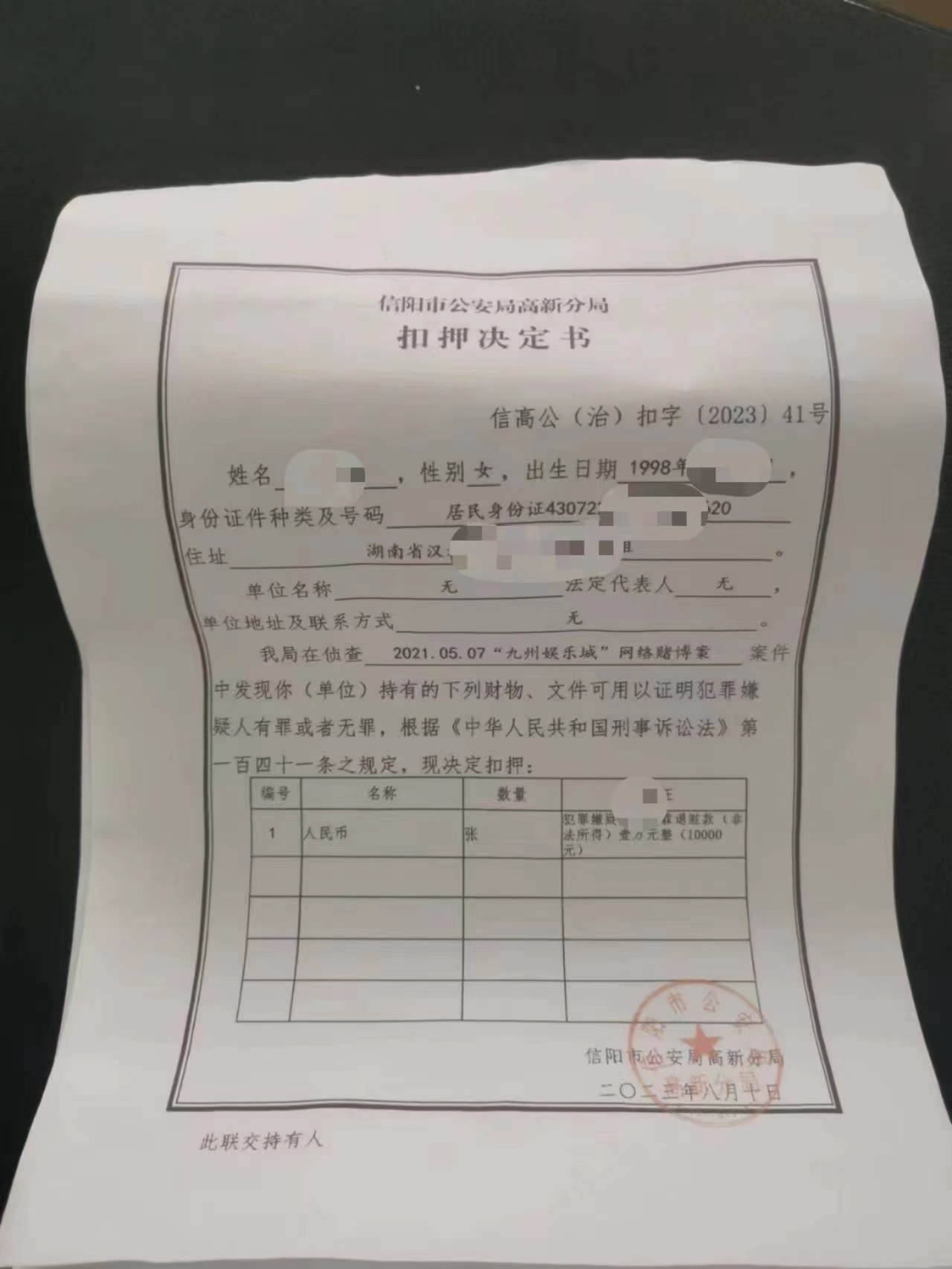 相关司法文书显示,2021年5月7日,信阳市公安局高新分局接“信阳市打击治理跨境赌博工作领导小组”信赌研令(2021)24号指令,将涉及“九州娱乐城”特大跨境赌博网站部分代理及窝点工作人员指定高新分局侦办。