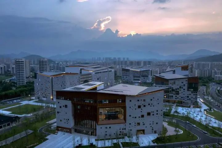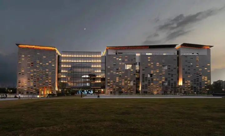 将城市融入自然之中,建筑本身就是一道风景。你看,那大面积的青灰色砖铺设外墙,是一眼明辨的烟雨江南;金属色高低起伏的屋顶与远山连成一片,隐喻江南群山延绵的天际线。