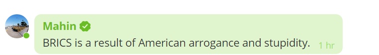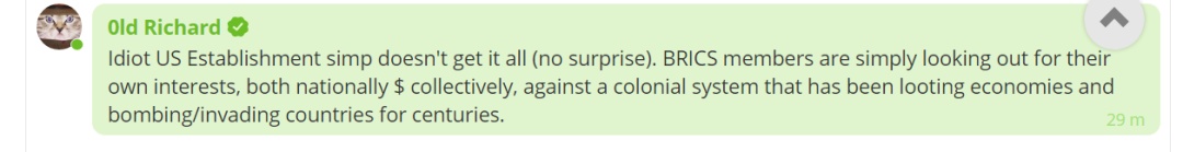 “愚蠢的美国建制派根本不明白这一切(毫不奇怪)。金砖国家(合作机制)成员国只是在寻求自己的利益,包括国家与集体利益,以反对几个世纪以来一直在掠夺经济和轰炸或入侵其他国家的殖民体系。”