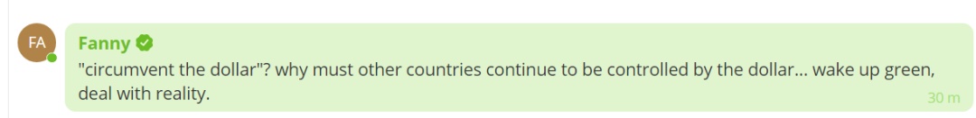 “‘规避美元’?为什么其他国家必须继续被美元控制……醒醒格林,面对现实吧。”