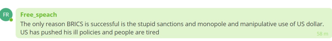 “金砖国家成功的唯一原因与愚蠢的制裁、垄断和操纵美元有关。美国一直在推行错误政策,人们已经厌倦了”。