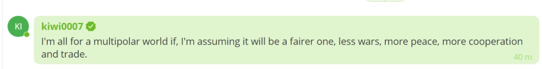 “我完全支持多极化世界,我认为这将是一个更公平的世界,是更少战争,更多和平,更多合作和贸易的世界。”