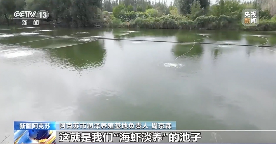 养殖基地负责人周京森介绍,养殖基地有两个塘子占地16亩,水是来自天山的雪水,虾苗是从海南引进的,养殖方式是“海虾淡养”。