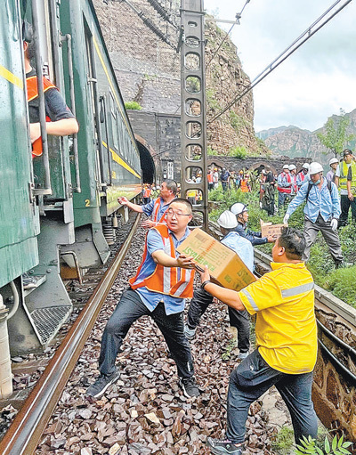 就在乘客被困雨中的同时,中国铁路北京局及时组织力量,调度物资,开展救援。张家口车务段火速调配6000份面包、八宝粥等救援物资并组织装车。7月31日晚8时56分,57402次物资运输列车从张家口站始发开往沿河城站。然而,由于线路损毁严重,物资运输列车只能抵达距离沿河城站8至9公里处,接下来的一段路,物资需要徒步搬运。