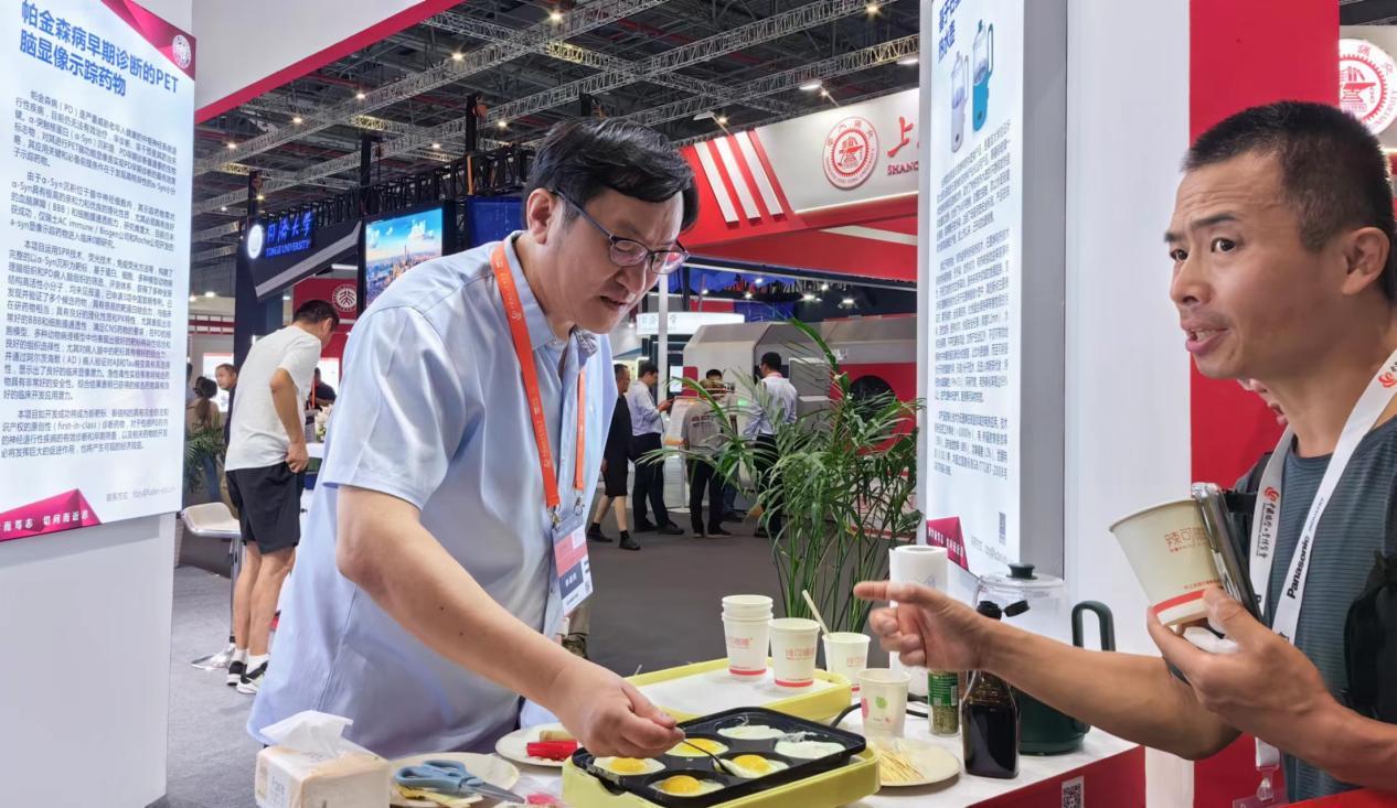 复旦大学展台前也很热闹。材料科学系顾广新团队为了推广石墨烯加热盘垫,现场做起了煎蛋,观众一面吃美食一面听顾教授介绍攻关过程和产品应用前景,很是惬意。