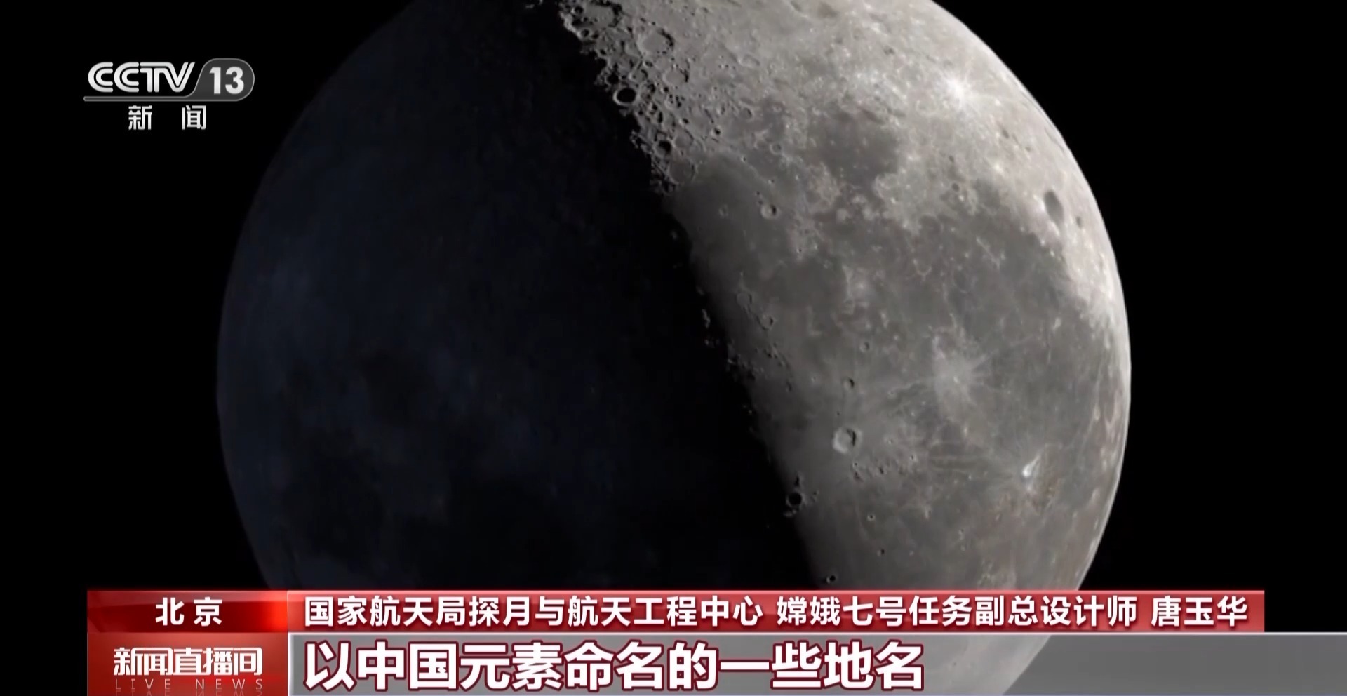 国家航天局探月与航天工程中心嫦娥七号任务副总设计师 唐玉华:(通过)获取的月球的影像,咱们国内的有些专家、有些单位,在国际天文联合会申请了以中国元素命名的一些地名,都是比较有中国传统文化的这些名字。