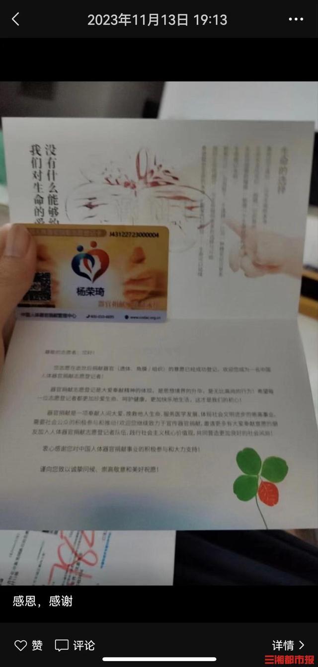 父母慢慢接受了他的想法。随后,杨荣琦在中国人体器官捐献平台完成捐献登记,并收到国家器官捐献中心寄来的实体卡。