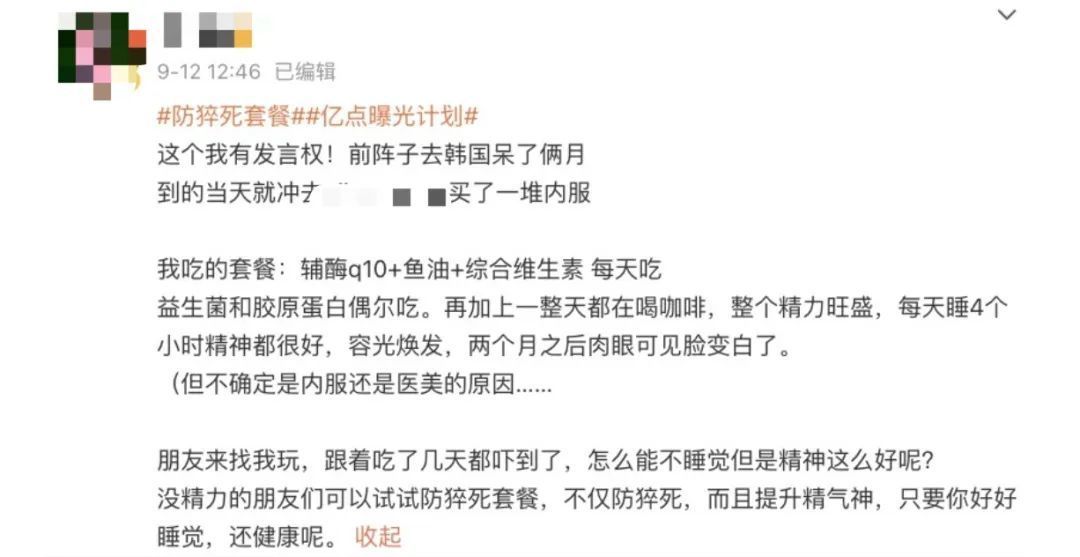 此前,某明星在综艺节目中就曾因吃太多保健品引发争议。“先喝一个美白的,再喝一个葡萄籽,再吃一个葡萄籽。再吃一包钙铁,还有锌、蜂胶,补气的,补铁的,童颜丸、鱼油、蔓越莓,阿胶……”