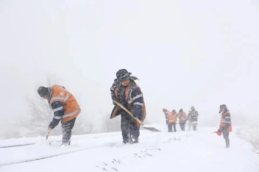 铁路作业人员在全国路网最北编组站三间房站场内进行道岔除雪作业。隋英伟 摄
