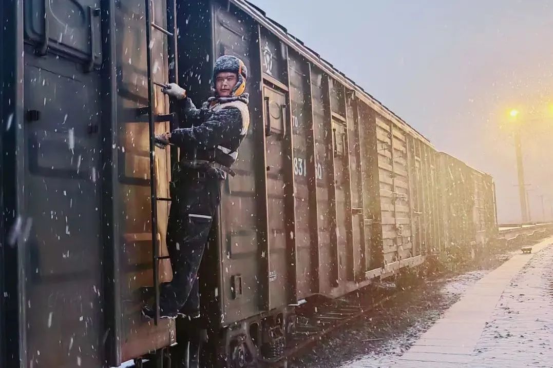 长治北车站,连结员在雪中进行牵出作业。郭文青 摄