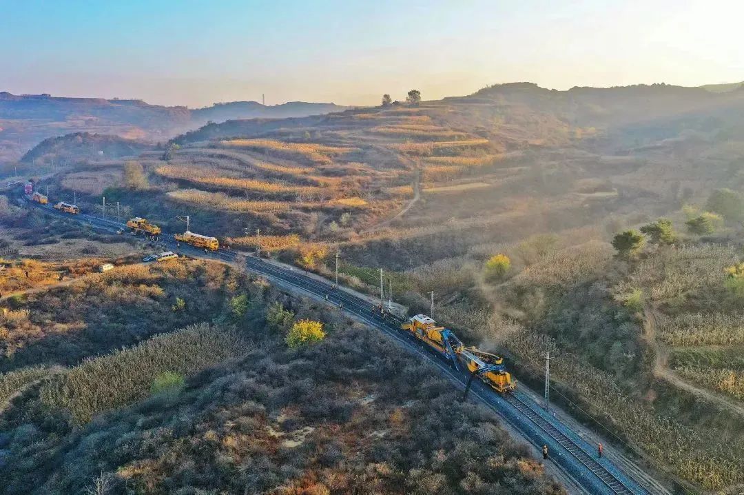 大型养路机械在太焦线孔庄站至东坡站区间进行换轨作业。王玮 摄