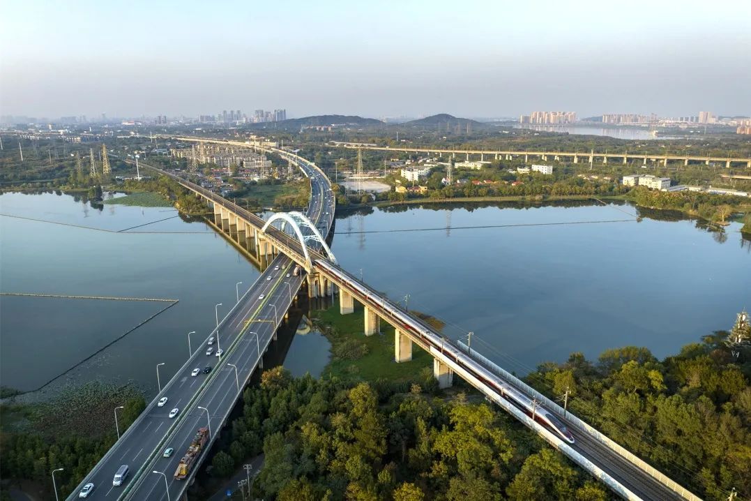 一列复兴号动车组行驶在京广高铁武汉段。彭琦 摄