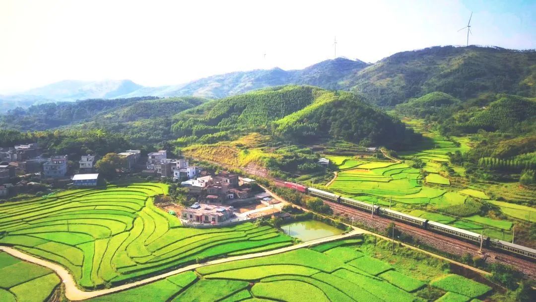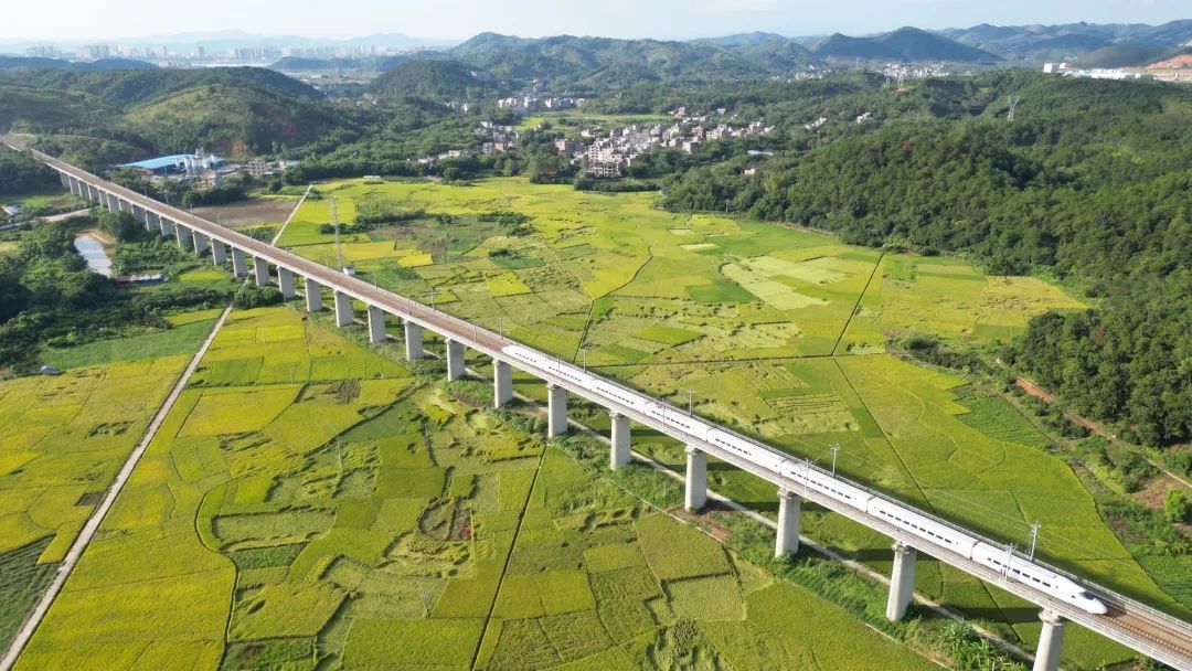 南广铁路梧州段,动车驶过稻田。唐烨 摄