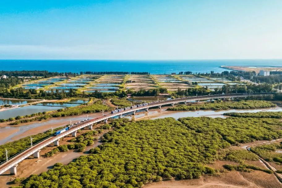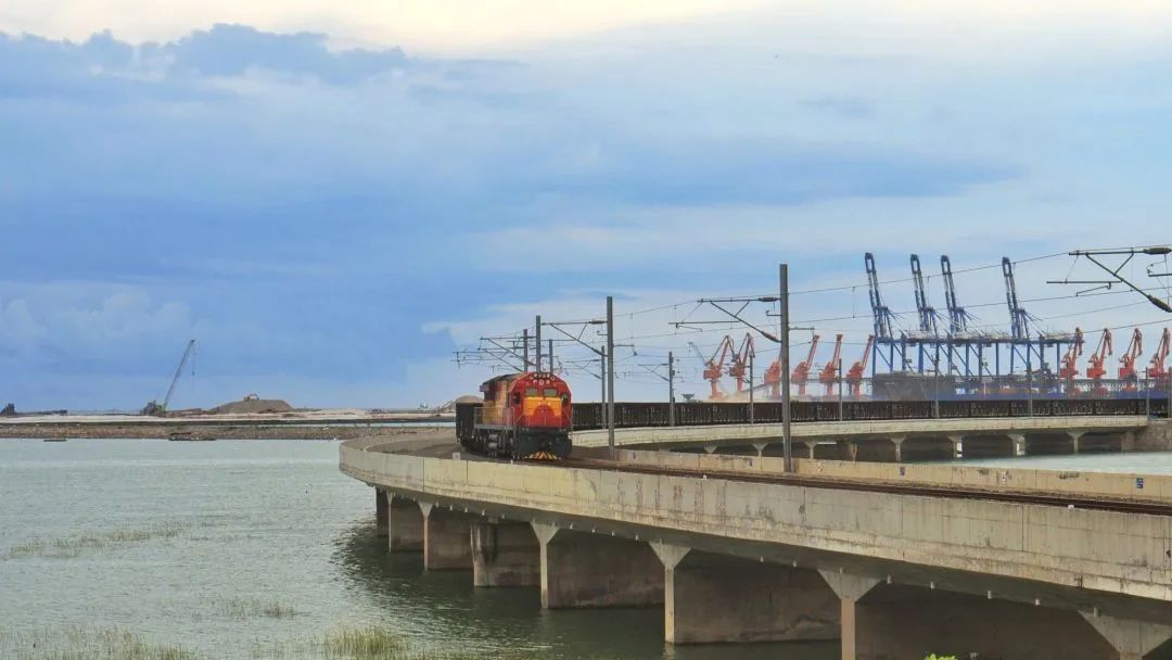 秋日晚霞下,一列货车从铁山港驶出。谭政超 摄