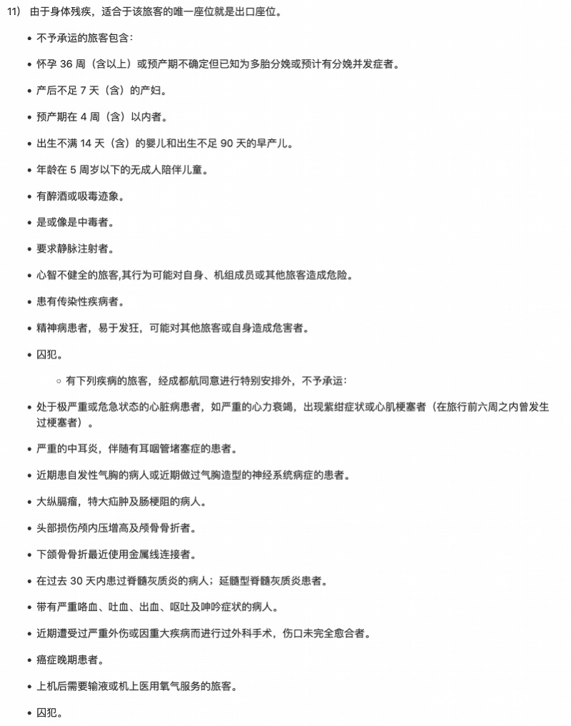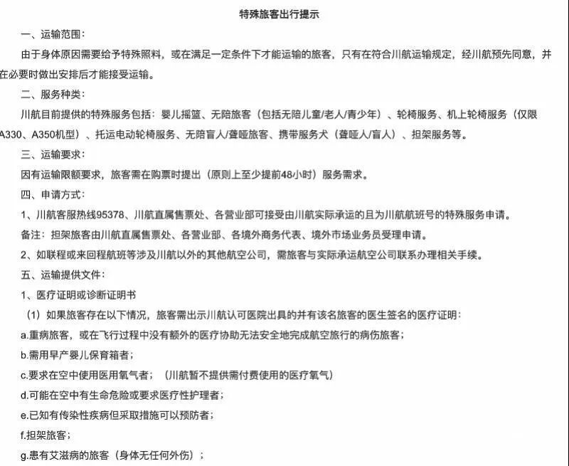 四川航空有限公司则规定,由于身体原因需要给予特殊照料,或在满足一定条件下才能运输的旅客,只有在符合川航运输规定,经川航预先同意,并在必要时做出安排后才能接受运输。其中包括重病旅客、担架旅客、需用早产婴儿保育箱者、患有艾滋病且身体无任何外伤的旅客等需要向其出示川航认可医院出具的,并有该名旅客的医生签名的医疗证明。