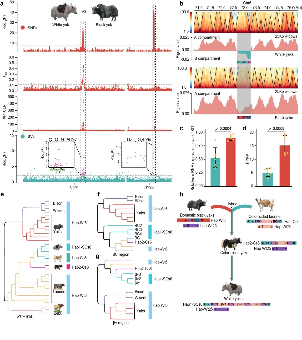 研究人员经过长期和艰苦的野外科学考察,不仅收集了所有的家养牦牛品种,而且还多次深入可可西里无人区采集了野牦牛样品,以及利用国际合作收集了国外相关近缘物种样品。创造性的将系统发育、生物地理学和群体基因组数据进行整合分析,首次将环境适应性、驯化过程和杂交渗入来源的基因组结构变异进行了区分,新鉴定了一批牦牛高原环境适应和驯化相关的关键基因和等位结构变异。特别是发现90%左右的家养牦牛,拥有通过远缘种间杂交渗入、来自黄牛的结构变异,占其基因组约1-5%,并且决定了家养牦牛的很多表型。如,牦牛通过与花黄牛杂交获得毛色变异的等位结构变异而形成花牦牛,该等位结构变异渗入后、又后续引发了新遗传突变,导致了纯白家养牦牛的出现。对上述鉴定到的关键结构等位变异,作者们通过染色质互作、基因表达和生化实验进行了证明,进一步阐明了这些复杂进化来源的等位结构变异如何促进了家养牦牛以及高原黄牛的表型多样性和环境适应性。该研究表明,家养动植物需要对不同进化来源的遗传变异进行有效区分,才能更为有效鉴定表型形成的关键基因;更为重要的是,远缘种间杂交仍应作为转基因和基因编辑时代最重要的育种手段,因为这种方式能同时导入更多基因、产生更多遗传变异和有用表型。