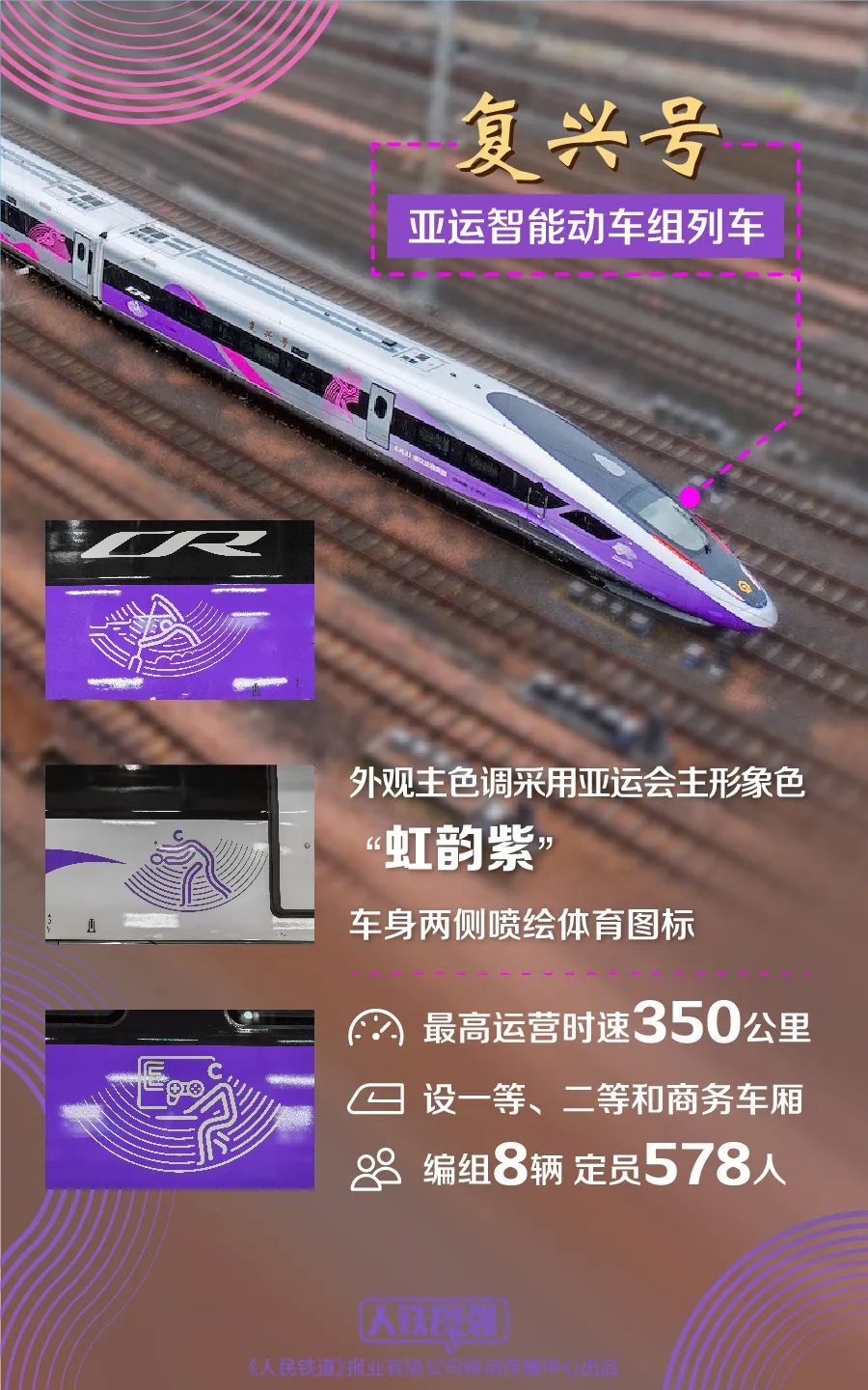 车体外观主色调采用亚运会主形象色“虹韵紫”,内外装饰选用杭州亚运会和江南文化元素,将亚运会会徽、口号和代表杭州特色的图形、文字充分融入其中。杭州粉墙黛瓦、钱江潮涌等城市景观元素与高速奔驰的复兴号列车融为一体。