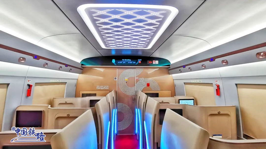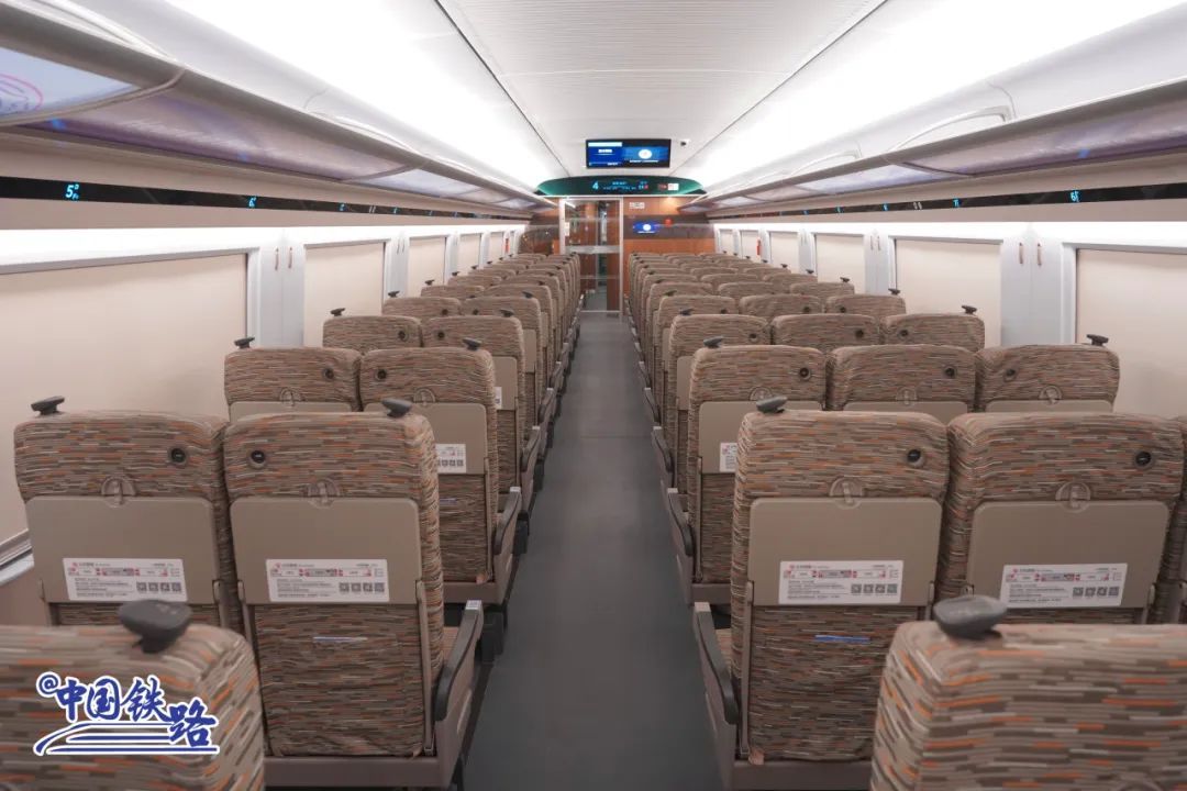 1号和8号车厢座位设置的智能交互终端提供高铁娱乐中心、无线投屏、运行信息等功能,旅客可在旅途中看电影、听音乐。