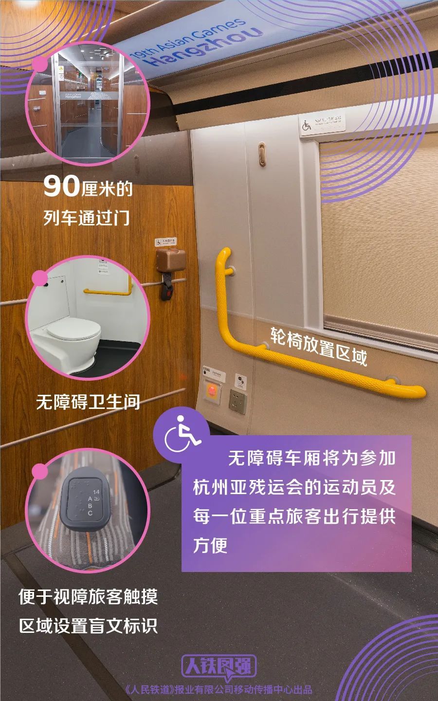 便于残疾人出行的4号无障碍车厢拥有更宽阔的过道,各处盲文可以引导、提示旅客找到座位。这里还专门设置了无障碍卫生间、轮椅存放区和大件行李存放处。