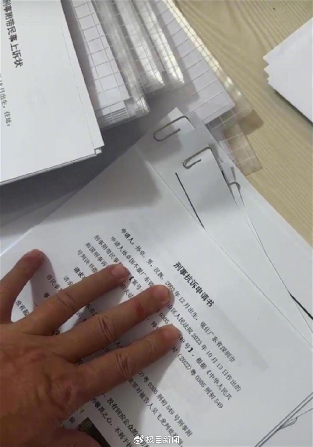 视频显示,孙海洋准备了一大叠资料,其中包括《刑事抗诉申请书》和《刑事附带民事上诉状》,有网友发现,《刑事抗诉申请书》的申请人写的是孙卓的名字。18日下午,孙海洋告诉极目新闻记者,这起拐骗案件中孙卓系被害人,必须由他提出申请,否则抗诉是无效的。但孙海洋担心影响孙卓,并未让儿子参与太多抗诉申请事项,只让他签了个字。孙卓也同意了,“他说就按爸爸的意思弄。”