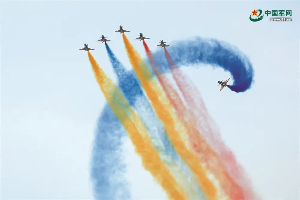 13日下午,喷涂五星红旗和八一军徽的歼-10表演机依次滑向起飞线。随着起飞指令下达,6架表演机分2批升空,从加力滑跑跃升到空中集结编组,动作一气呵成、优美流畅。在现场观众期盼中,空军八一飞行表演队以大箭队通场拉开了六机飞行表演的序幕,紧接着以超密集编队低空掠过,引起现场观众一片喝彩。六机斤斗、五机雁队通场、四机垂直向上开花、单机小速度平飞……从多机编组到单机飞行,20多个表演动作连贯流畅,展现出中国空军飞行员高超的飞行技术和战机优越的机动性能。