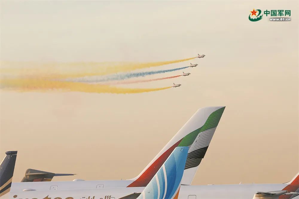 11月13日,第十八届迪拜航空展在阿联酋迪拜阿勒马克图姆机场开幕。当天,中国空军八一飞行表演队与阿联酋“骑士”、意大利“三色箭”、俄罗斯“勇士”等多支世界知名飞行表演队共舞蓝天,向世界展示了中国空军的风采。