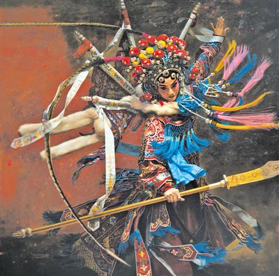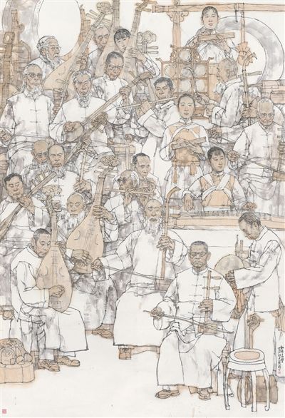 一些美术作品直接表现文化遗产的时代风采,捕捉传统工艺造物、民间戏曲表演、民族歌舞仪式的瞬间,把握劳作中的欢愉、戏曲中的传承、歌舞里的生活,形成富有层次、感染力和思想深度的表达。例如,录洁囡中国画《碑拓》以工笔技法描绘了一位正在拓碑的老手艺人,大面积的黑白拓片使作品充满静穆之美。透过人物专注的神态,观者不难感受到手艺人在时代变化中对传统文化的执着坚守。王力克油画《传奇·流光溢彩》,将刀马旦的飒爽英姿和稍纵即逝的美定格为浓墨重彩的画面,喻示传统戏曲发展的勃勃生机。韩硕中国画《纳西古乐》,以凝练的笔墨,将老中青三代乐师的形象刻画得入木三分、各具神韵,生动讲述了非物质文化遗产活起来的中国故事。这些作品画“遗产”却不止步于历史、不疏离于生活,在描绘平凡日常中展现了文化遗产保护和传承的步伐。
