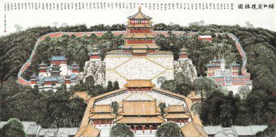 历经岁月洗礼的文化遗产,在自然环境的映衬下,更添几分神韵。许多美术作品也以此为切入点,通过当代艺术视角,再次体验、发现、认识文化遗产的独特魅力。靳尚谊油画《世界文化遗产——海龙屯》,以充满诗意的笔法描绘了这座幽藏群山之间的土司遗址。画面中,优美的自然风光与厚重的土司文化交织,屹立的石质建筑遗存蜿蜒伸向远方,带领观者一同走入历史风云。毛岱宗油画《云冈石窟全景》,展现了意蕴宏大的摩崖造像,也映现出我国自古以来致力于促进文化交流、文明交融的胸襟。张仁芝中国画《颐和园揽胜图》,以传统山水画的散点透视构图,综览颐和园万寿山的园林布局和主体建筑群,通过自然景色和人工建筑的巧妙结合,展现皇家园林集雄秀为一身的人文景观……借助这些美术作品,观众得以再次深刻注视、深情凝视、深入体验我国文化和自然遗产的魅力。
