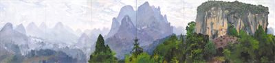 在不少作品中,山川河流不再是人物形象的背景,富有特色的自然景观也不只是画面的点缀或信息的载体,而是透射着人的情谊、品格和精神的自然,是哺育、塑造了地域人文风情的自然。像张路江油画《壮美广西》,林立高耸的奇峰既展现了中国南方喀斯特的典型风貌,又承载着漓江山水之境的丰厚底蕴。经由美术工作者的“加工”,中华大地自然遗产中的人文属性、精神内涵得到了淋漓尽致的诠释和表达。作品往往融入了创作者的生活视角、生命体验和艺术灵感,富有感染力。