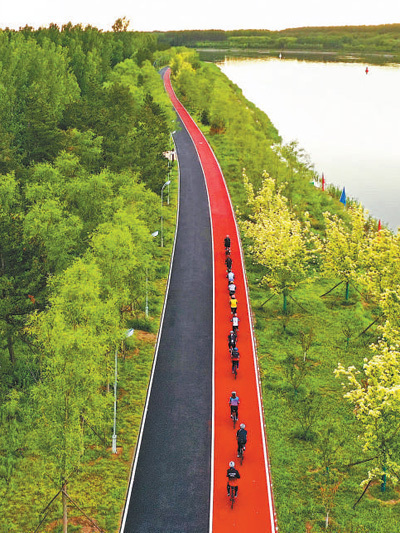 健身爱好者在大运河绿道骑行。本报记者 雷 声摄