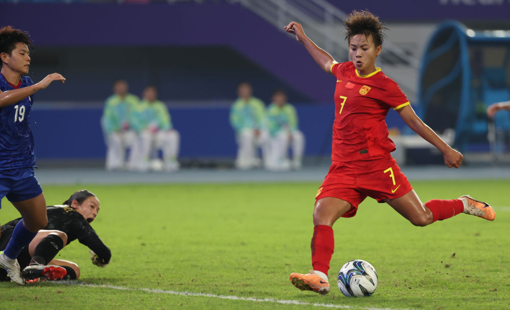 9月30日,中国队球员王霜(右)在亚运会足球项目女子组四分之一比赛中射门。新华社记者 龚兵 摄