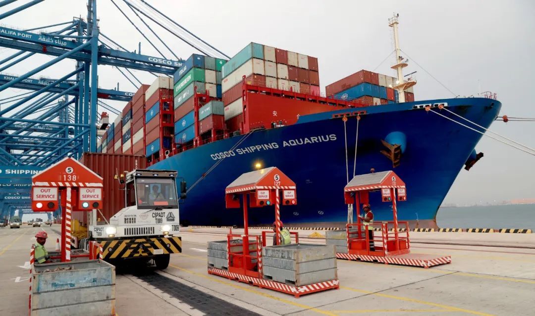 大型集装箱货轮停靠中远海运港口阿联酋阿布扎比码头。管克江、纳达尔·达乌德摄影报道