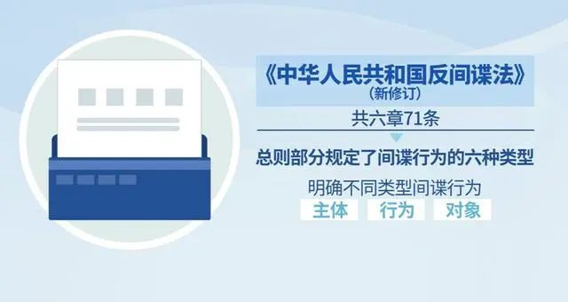 据介绍,新修订的反间谍法自今年7月1日起施行,这是自2014年反间谍法实施以来的一次全面修订。新修订的反间谍法共六章71条,在总则部分规定了间谍行为的六种类型,明确不同类型间谍行为的主体、行为、对象。在原本规定的基础上,把受间谍组织及其代理人以外的其他境外机构、组织、个人指使“窃取、刺探、收买、非法提供国家秘密、情报以及其他关系国家安全和利益的文件、数据、资料、物品”等明确为间谍行为。实施间谍行为,构成犯罪者将被依法追究刑事责任。
