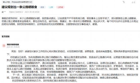“过去家家户户有平场,有地方晒粮食,现在基本上没有平场了,只能在公路上晒。”9月初,河南省南阳市新野县孙先生在“领导留言板”上反映公路晒粮现象,希望相关部门重视该问题,找到合适的解决办法。