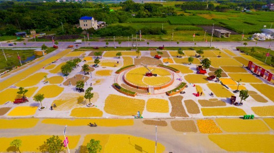 “往年晒谷场地难找,大家只能见缝插针,这里晒一点,那里晒一点,今天这里晒晒,明天那里晾晾,几亩田的稻谷要晒个五六天才能干,现在不用愁场地了,两三天就能晒好。”徐大爷边说边将纤维袋内的稻谷倒在镇政府广场空地上晾晒。沙岗镇政府相关工作人员介绍,为了解决可晒谷场地严重不足的问题,当地利用镇政府门前广场,为农户开放了3000平方米晾晒场地,让农户铺起一方方金黄稻子。
