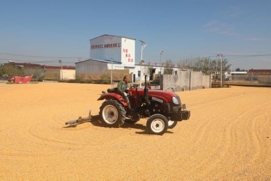 莒南县道口镇赫马岭村代彬土地股份专业合作社大院,农民正在晾晒玉米。韩永武摄