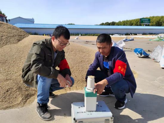 大兴农场党员志愿者帮助种植户测量粮食水份。孟庆文摄