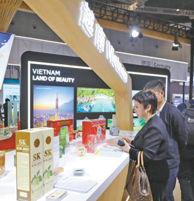 11月6日,参观者在第六届进博会国家展越南展台挑选商品。