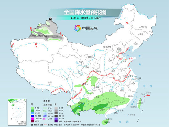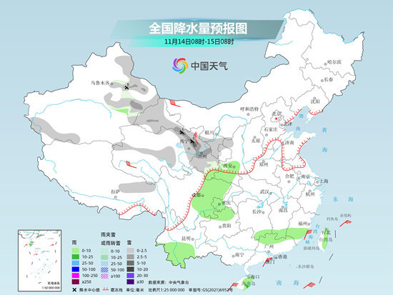 具体来看,今天,新疆北部等地部分地区有小雪或雨夹雪,局地有中到大雪。西南地区南部、江南南部、华南大部等地部分地区有小到中雨,局地有大雨。